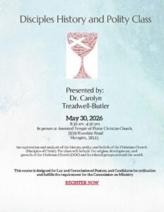 If you need Disciples History and Polity for the Commission on Ministry, From time to time the Christian Church in Tennessee may offer courses. This regional course is designed for Lay and Commissioned Pastors, and Candidates for ordination who may need the course for graduation.